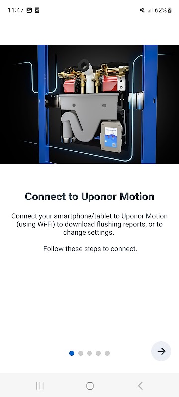 Met de Uponor Motion app kunnen installateurs de Uponor Motion hygiënespoeling zeer efficiënt instellen. De mobiele telefoon maakt via WiFi verbinding met het Uponor Motion hygiënesysteem.