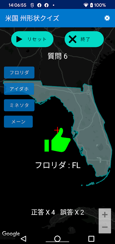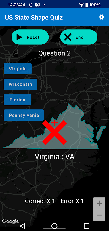 This app is to choose the state from the state shape of USA state with 4 choices.