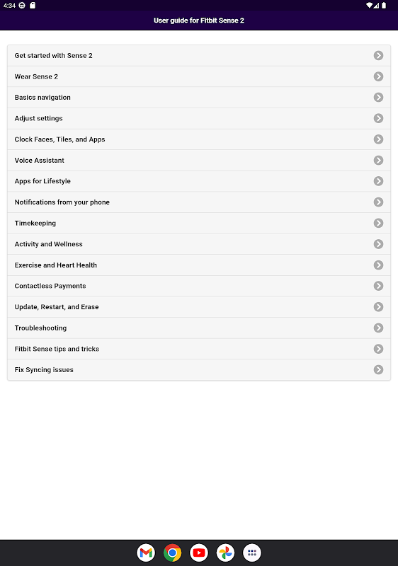 Leer uw training, hartgezondheid, ECG, stress en slaap beheren met de Fitbit Sense 2 geavanceerde gezondheids- en fitnesssmartwatch. Deze applicatie is ontworpen om je te helpen het meeste uit je Fitbit Sense 2 te halen. Als je op zoek bent naar een gemakkelijk leesbare Fitbit sense 2-handleiding, dan kun je deze app gebruiken. Dingen omvatten: