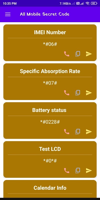 Deze app biedt 49+ ussd-codekiezer van verschillende mobiele telefoons, waaronder Apple ussd-codes. Ussd-codes ook wel geheime codes voor telefoons genoemd. U kunt hardware- en softwaredetails vinden, zoals hardwareversie, IMEI-nummer, simgegevens en nog veel meer van deze ussd-codes. Netwerktest en diverse andere diagnosetests zijn ook mogelijk vanaf deze ussd-codes.