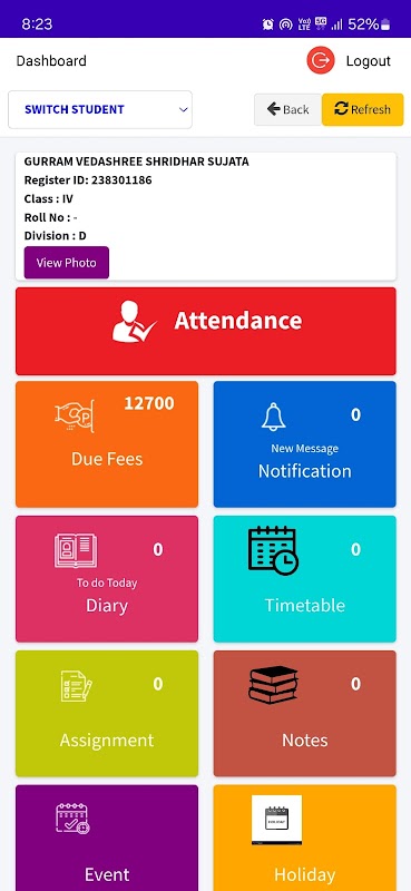 Mobiele app voor volledig instituutsbeheer met online toegang, betaling van kosten, aanwezigheid, melding, thuiswerk, tijdschema, resultaat