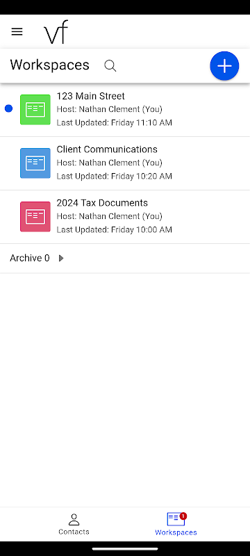 Verifyle gebruikt Workspaces om u te helpen bij het organiseren van uw informatie. In een werkruimte vind je gasten (de mensen met wie je iets wilt delen), berichtenthreads en documenten. Je bepaalt precies wie wat ziet, met een tik van je vinger.