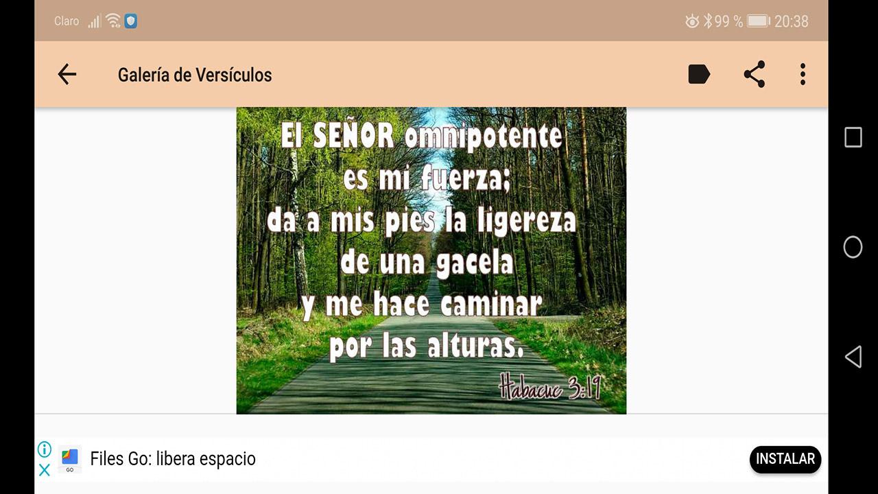 De verzen van deze applicatie is liefde, aanmoediging, aanmoediging, geloof, vergeving, Gods beloften, beloften van de hemel, heiligheid, verering, lof, hoop, wijsheid, leer, psalmen, gezegden, woorden van Jezus, gezinsraden, en de hele raad van God voor je leven, werden de teksten van de Bijbel Reina Valera 1960 (RV60).