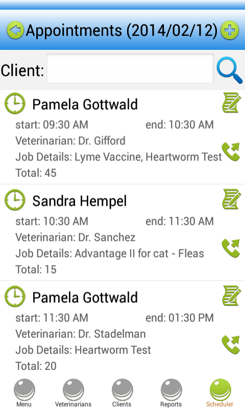 ★ Het gedeelte Klanten bevat op dezelfde manier het volledige profiel en de geschiedenis van elke klant (in dit geval dieren), samen met het adres van hun eigenaar, telefoonnummer, e-mailadres en andere contactgegevens. De optie om rechtstreeks vanuit de software naar clients te bellen, is ook aanwezig.