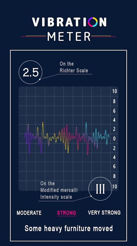 This Vibration Meter App uses acceleration sensor to measure vibration or an earthquake, and it shows a reference as a seismic detector. Vibration Meter Alarm App is an App called seismograph or seismometer, which measures the strength of vibration, quakes, earthquakes, vibrations of the human body or any other objects around you. Digital Vibration Meter is a seismic scale used for measuring the intensity of an earthquake. vibration meter free measures the effects of an earthquake and vibration meter App is distinct from the moment of magnitude.