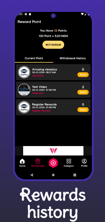 Maak u klaar om uw inhoudsbetrokkenheid om te zetten in beloningen met ViewPlus! Of u nu uw favoriete citaten uploadt, video's verkent of GIF's deelt, met ViewPlus kunt u eenvoudig beloningen verdienen terwijl u verbinding maakt met spannende inhoud. Dit is wat ViewPlus tot uw favoriete app maakt voor het verdienen, delen en ontdekken: