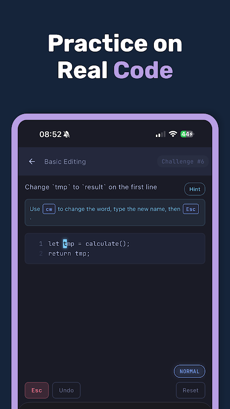 VimKata leert je het mentale model. De telefoon leert je de grammatica; de terminal leert je typen. Pak de app 10 minuten op tijdens je reis, een pauze of voor het slapengaan – en pas wat je hebt geleerd vervolgens toe op een echt toetsenbord.