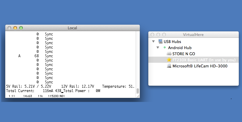 De volgende schermafbeelding toont een Apple Mac-machine die toegang heeft tot een FTDI-serieel apparaat dat is aangesloten op een extern Android-apparaat. d.w.z. serieel over IP