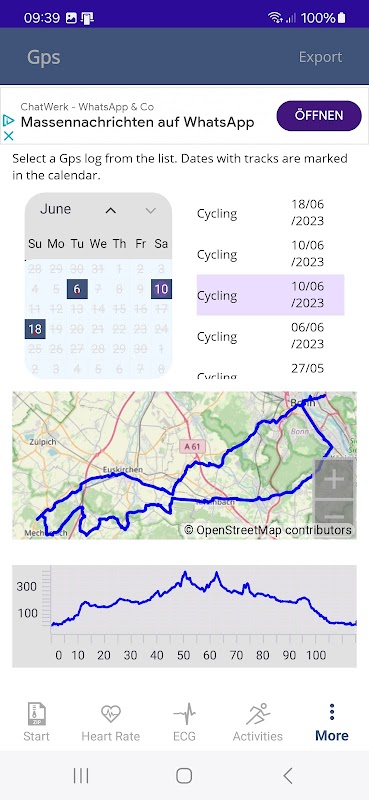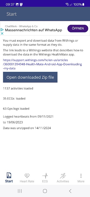 Met deze app bekijk je de hartslaggegevens en ECG's die je met je Withings smartwatch hebt opgenomen volledig gedetailleerd. En u kunt deze grafieken exporteren als png-bestand of de gegevens opslaan in csv-formaat. De geëxporteerde ECG-gegevens worden voorbereid voor analyse met andere tools (bijvoorbeeld met het Python-pakket pyHRV).