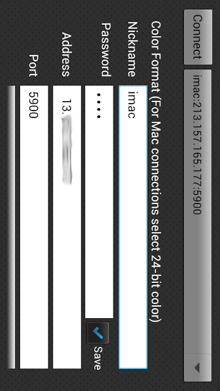 To start using VNC Client enter a Nickname for the connection, enter the Password, IP address and port (default is 5900) and click Connect.