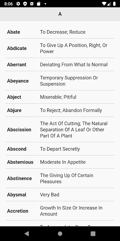 Een uitgebreide werkwoordenschat is een voorwaarde voor succes bij het afleggen van tests op het GRE Graduate Record Exam. Deze app presenteert 800 woorden op universitair niveau met definities die vaak op het examen voorkomen. Gemakkelijk te lezen woord en betekenis.