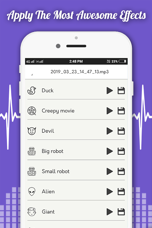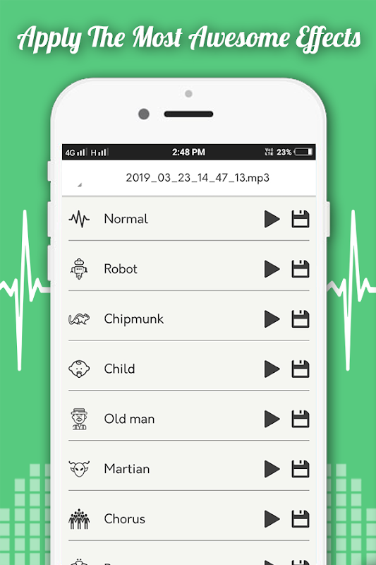Your voice will change according to chosen sound effects. You can save converted voice effects in the memory of your phone, on SD card or share it with your friend via popular social portals