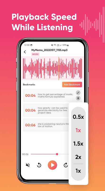 U kunt op elk moment audio opnemen tijdens vergaderingen in deze spraaknotitie-app met een simpele klik en voorkomen dat u belangrijke informatie en taken kwijtraakt die tijdens de vergadering zijn besproken. En kan ze horen wanneer dat nodig is. Hier, in deze voicerecorder-app, kunt u uw spraakmemo eenvoudig afspelen, beheren, bewerken, bookmarken en delen. Deze app biedt ook een functionaliteit om opnames in verschillende categorieën te categoriseren. En het meest verbazingwekkende is dat je je eigen categorieën kunt maken en er opnames aan kunt toevoegen.