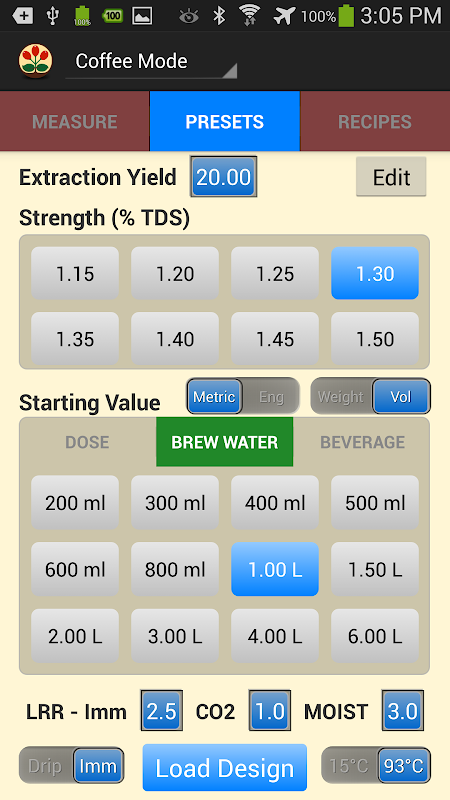 • Selecteer de gewenste sterkte en drank hoeveelheid, tikt LOAD en VST CoffeeTools berekent en toont alle bijbehorende brouwen parameters, grafieken het ontwerp en de displays meetresultaten.