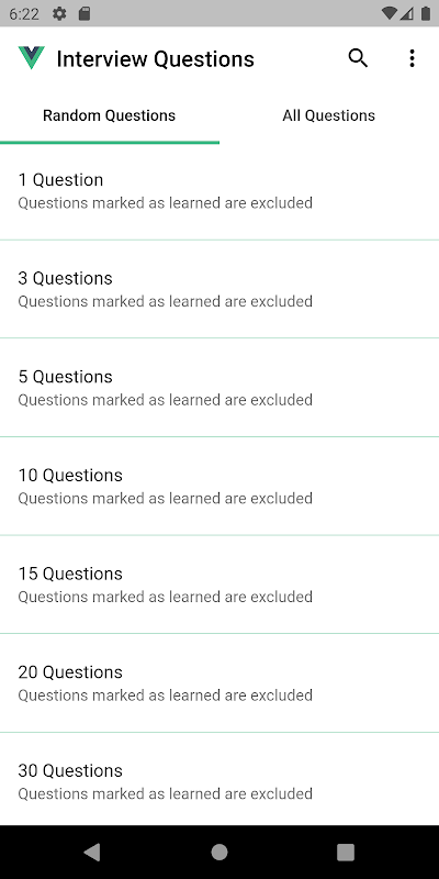 Practice the Vue.js interview FAQ and answers within your phone. Learn by selecting a random questions, exclude questions by marking it as "learned" or create a set of questions by adding it to your "bookmarks".
