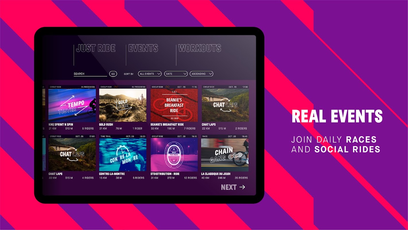 Maak, plan of doe eenvoudig mee aan groepsritten, races en evenementenreeksen. Je kunt zelfs virtuele renners toevoegen om het peloton te vullen en je extra motivatie te geven. Pas hun vermogen en rijstijl aan voor een nog realistischere race-ervaring.