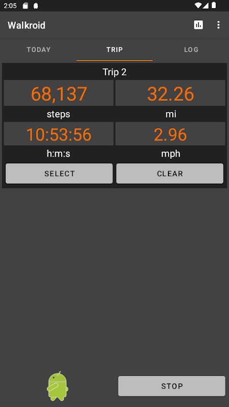 Walkroid - eenvoudige stappenteller - geeft uw huidige stappen en afstand weer. Het heeft ook rittellers zodat je de afstand tussen twee willekeurige punten kunt meten door te lopen of elke stap te stappen.
