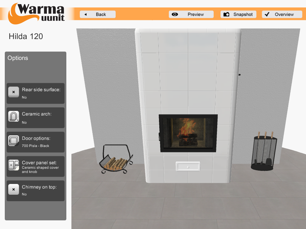 This app was created for partners of Warma-Uunit. Getting familiar with our stove collection, its technology and operation has never been easier. Learn about the operating principle of a heat storing stove, or design a stove by picking a suitable model and adding desired accessories.