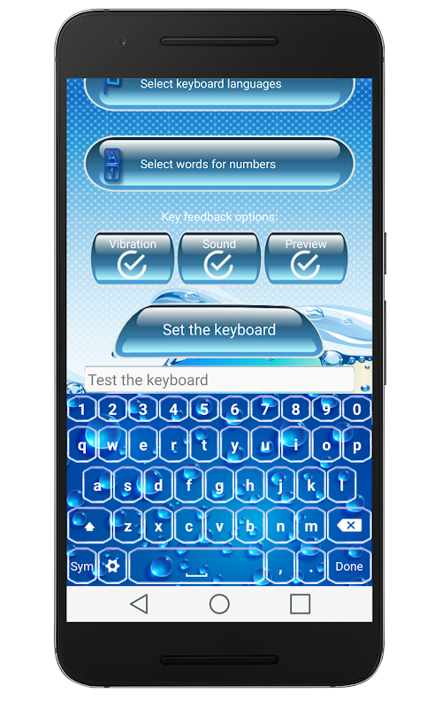 Haal het beste Water Toetsenbord op de markt en het lijkt alsof je aan het typen op het water sleutels! Probeer onze nieuwe schrijfmachine met verbazingwekkende "SMS thema's" die je op een onderwater avontuur zal nemen! Tekstberichten zal een compleet andere ervaring met dit toetsenbord lay-out te worden! Zet hem op elk van de 5 gemeenschappelijke taal en stel uw nieuwe Android™-toetsenbord!
