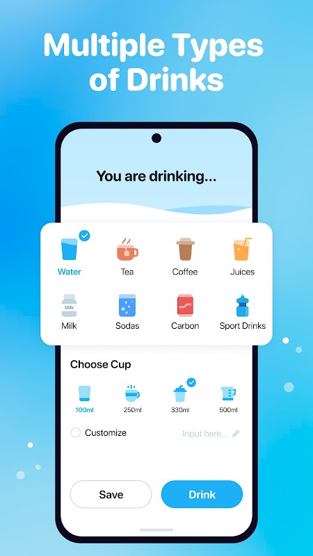 🥤 Verscheidenheid aan drankjes: Water Tracker-WaterDolphin beperkt je niet tot alleen water. We weten dat het leven vol keuzes is, dus u kunt kiezen uit een verscheidenheid aan dranken die u dagelijks drinkt. Van thee tot frisdrank tot smoothies, wij staan voor u klaar.