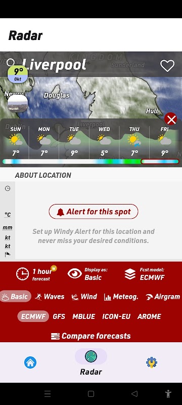 - Radarkaarten op uw locatie met zoom- en besturingsopties-