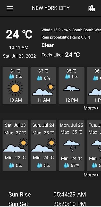De app biedt de huidige temperatuur, zonsopgang en zonsondergang volgens de tijdzone van de stad.