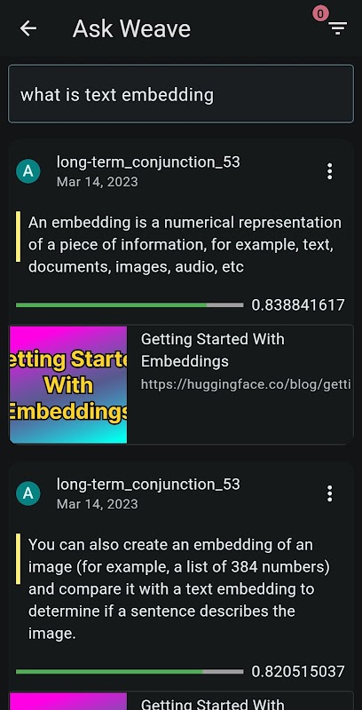Het gebruik van Weave Browser is eenvoudig - open gewoon de browser in de app en markeer alles wat in het oog springt. Weave Browser gebruikt dan zijn krachtige algoritmen om uw hoogtepunten op onderwerp te ordenen, waardoor het gemakkelijk wordt om vragen te stellen en later de meest relevante inhoud te vinden. Vraag iets van "Wat is de zin van het leven?" naar "Wat is een goed idee voor een gezond diner?" en Weave Browser toont je de hoogtepunten van je reis door het internet die je vraag het beste beantwoorden.