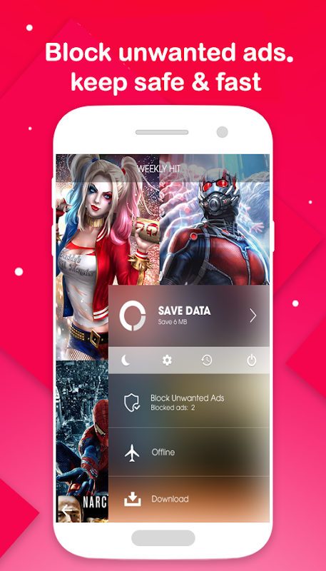 Ad block functionality blocks different forms of ads that affect your browse experience, not only make the page loading speed faster, but also reduce the internet data usage for users.