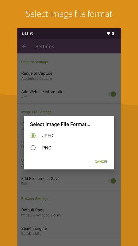 Selecteer afbeeldingsbestandsformaat (JPEG of PNG)