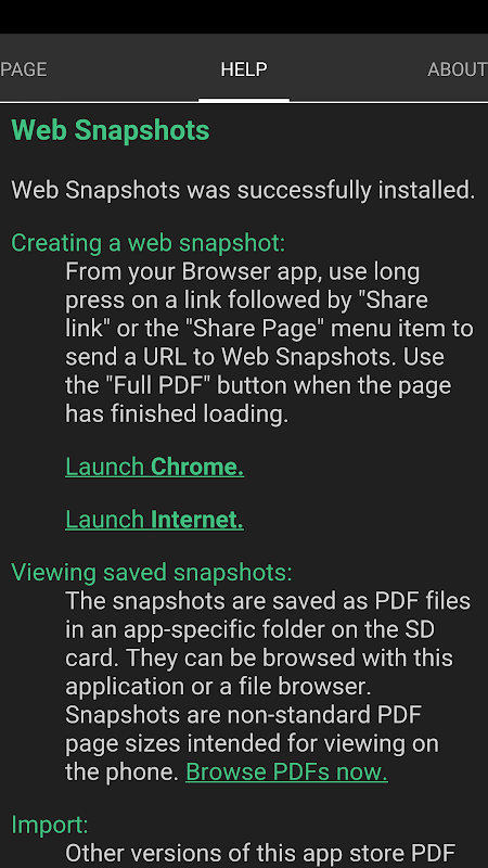 * The snapshots created by this app are in a unique tower or vertical banner format that fits an entire web page onto one non-standard PDF document. They are exact pixel reproductions of the page you see in the web browser and make great proofs for web designers.