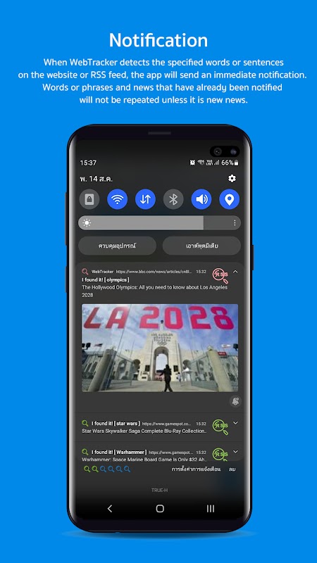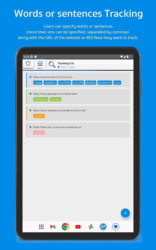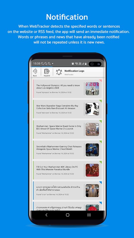 Hoe de app werkt: Wanneer de app de opgegeven woorden of zinnen detecteert op de websites of RSS-feeds die u hebt ingesteld, wordt u hiervan onmiddellijk op de hoogte gesteld. Als u per ongeluk een melding negeert, kunt u het trackinglogboek in de app bekijken. De app verzendt geen dubbele meldingen voor hetzelfde nieuws, zodat u geen dubbele waarschuwingen ontvangt.
