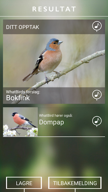 WhatBird prøver å hjelpe deg på rett spor, men kan ikke love å alltid gi riktig svar. Derfor bør du lytte til ditt eget opptak og sammenligne dette med den/de artene WhatBird foreslår. Er det samme fugl?