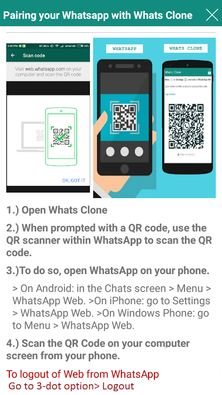 The app lets you pair Whatsapp Accounts from both iPhone as well as Android. You just need to scan the code generated in Whats-Clone to the specified device.