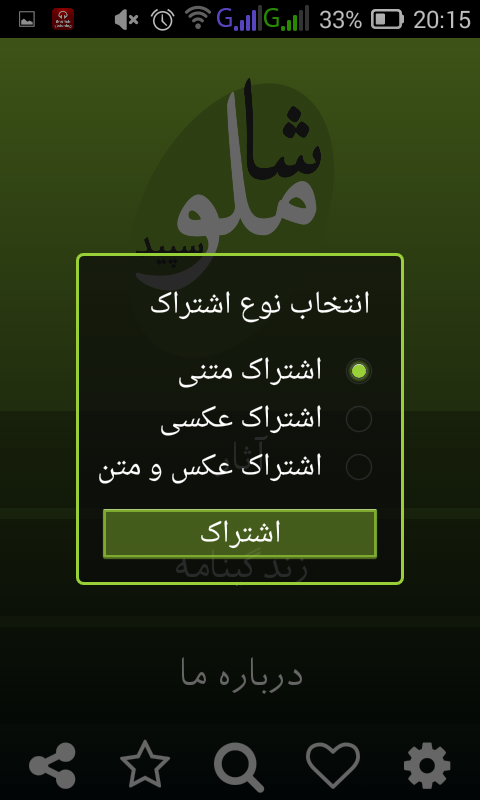 اشتراک گذاری : با کمک این امکان شما می توانید لذت خواندن اشعار را با دوستان خود به اشتراک بگذارید. قابلیت اشتراک گذاری این برنامه بصورت عکس و متن یا هر دو حالت می باشد و تمامی شبکه ها و برنامه های ارتباطی و اجتماعی نظیر فیسبوک، اینستاگرام، تلگرام، واتساپ، توییتر یا ارسال بصورت پیامک و ایمیل ... را پشتیبانی می کند .