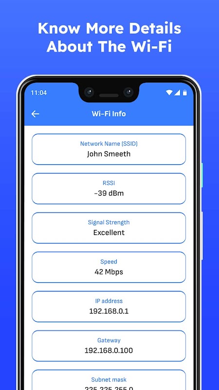 Get more detailed information about your WiFi connection like Status, Frequency, Link Speed, SSID, BSSID, Vendor, IP Address, MAC Address, etc.