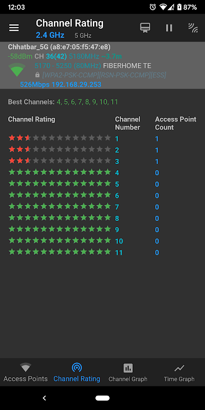 WiFi Analyzer tests signal strength and channel rating!