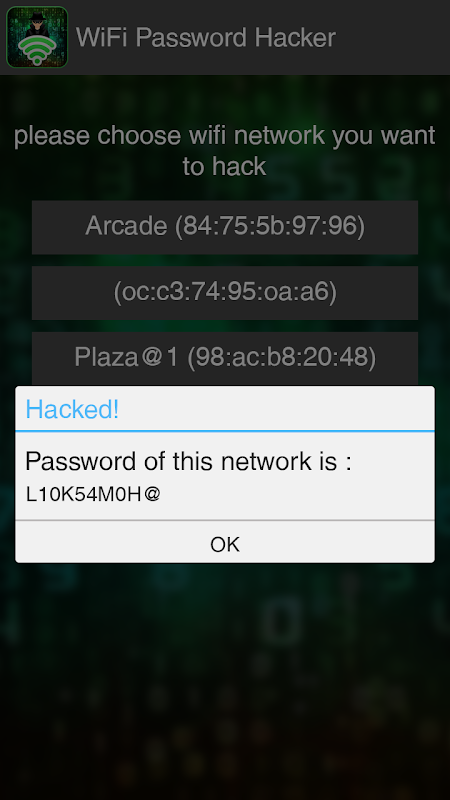This is prank application that gives you impression that you can hack a wifi network. You can create an illusion that you can hack into secured wireless networks protected with WPA, WPA2 encryption.