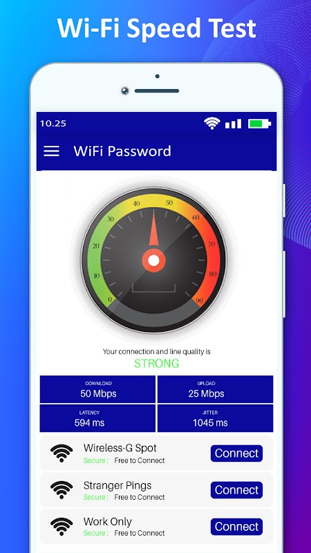Wifi-snelheidstest geeft je de PING-, upload- en downloadsnelheid van de wifi-verbindingen. Deze snelheidstestmeter helpt je om de ping-, download- en uploadsnelheid van het verbonden netwerk nauwkeurig te meten en de netwerkbeveiliging van wifi-hotspots te garanderen.