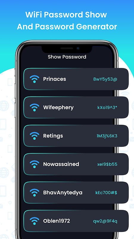 Hiermee kunt u uw WIFI-wachtwoord bekijken op plaatsen waar u verbinding hebt gemaakt. Wachtwoorden worden op uw apparaat in de lijst opgeslagen en u kunt uw wifi-wachtwoorden kopiëren en delen met deze show wifi-wachtwoord-app.