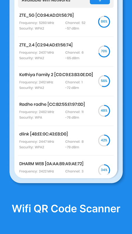 Scan Wi-Fi QR-codes moeiteloos en maak in een mum van tijd verbinding met draadloze netwerken. Geen gedoe meer met lange en complexe wachtwoorden! Onze Wi-Fi Scan QR Code-scanner-app ontcijfert gecodeerde informatie die is ingebed in Wi-Fi QR-codes, waardoor het instellen van een netwerk een fluitje van een cent wordt. Of u nu in een café, op de luchthaven, in een hotel of bij een vriend bent, u krijgt eenvoudig toegang tot Wi-Fi-netwerken door de meegeleverde QR-code te scannen.