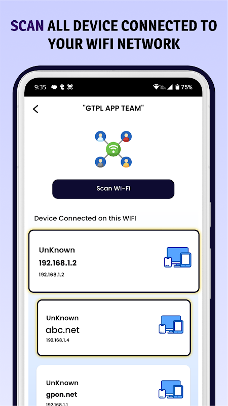 Gebruik de krachtige wifi-scanner en IP-scanner om direct wifi-apparaten te vinden, wifi-verbonden apparaten te controleren en gedetailleerde informatie over elk verbonden apparaat te bekijken, inclusief IP-adres, MAC-adres en verbindingsstatus.