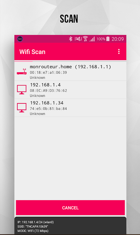 This application scan you network hosts one by one and get as much information as possible such as hostnames , IP addresses , MAC addresses , Type of device and much more. Then it lists this informations for you. It also give you data about your wifi network status.