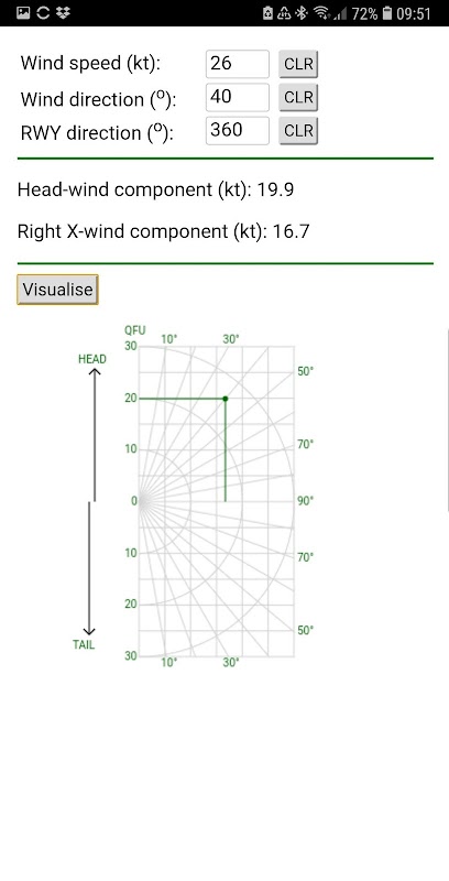 The mobile application allows you to practice the calculation of the head/tail-wind and the cross-wind components relative to the bearing of a runway (QFU) or track.
