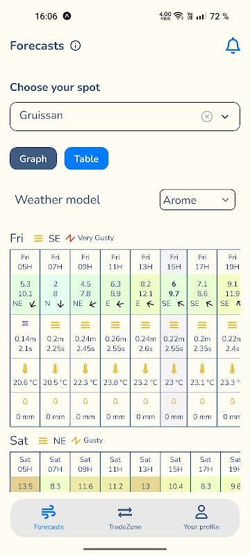 Visualiseer wind- en golfvoorspellingen in grafieken of tabellen, zodat je zelf kunt bepalen hoe je je volgende sessie plant.