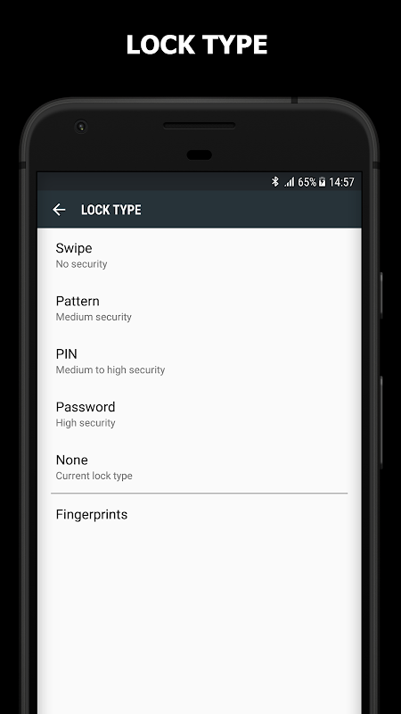 - Meerdere vergrendelingsmethoden: vegen, patroon, pincode, wachtwoord