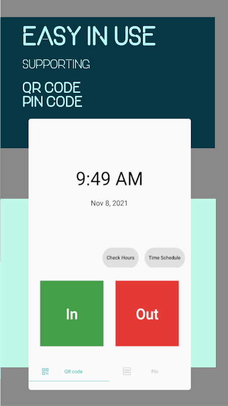 Voor het aanwezigheidssysteem is het noodzakelijk om één mobiele telefoon of tablet als aanwezigheidsterminal te gebruiken. De aanwezigheidsapplicatie zal op deze terminal draaien in de opnamemodus. Afhankelijk van het geselecteerde niveau is het mogelijk om de medewerker te herkennen aan de hand van de toegekende pincode, of met behulp van de ondersteuningsapplicatie voor medewerkers ("Aanwezigheid - medewerkeridentificatie") met de gegenereerde QR-code op de telefoon van de medewerker.