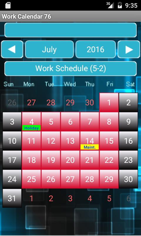 Deze kalender is speciaal ontworpen voor de medewerkers werkzaam bij Crown fabriek 76. Deze toepassing zal die personen met een werkschema met daarin de mogelijkheid om te veranderen van een 4-4 schema om een 3-3-1 of 5-2 te verschaffen. Stel vakantie data, samen met vakanties, onderhoud dagen, revisie, overwerk, en etc.