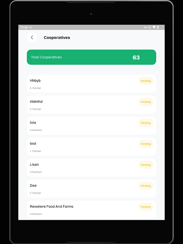 Wordt gebruikt om coöperaties op te richten en boeren te registreren die zijn gekoppeld aan een gecertificeerd magazijn verspreid over het land.