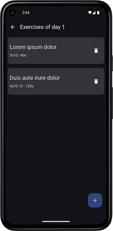 Aangepaste trainingsroutines opslaan (niet gegenereerd door de app): Voeg oefeningen toe met naam, sets, herhalingen en gewicht.