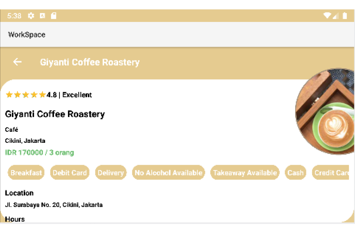 You can search places you want and see the rating, location, phone, operational hour, review, and price.